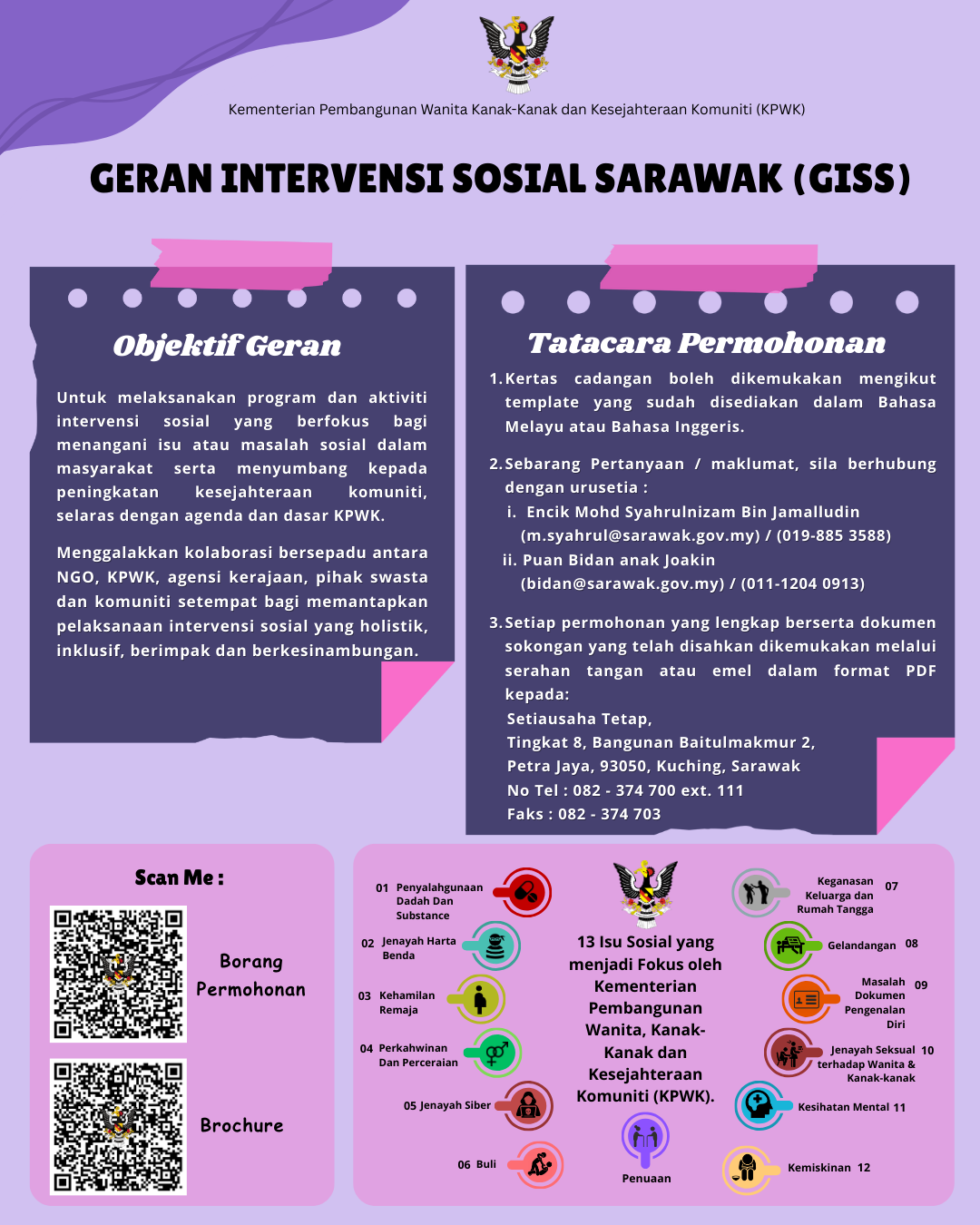 Geran Intervensi Sosial Sarawak (GISS) 2026 dibuka kepada Badan Bukan Kerajaan (NGO) yang berdaftar dan aktif di Sarawak bagi melaksanakan program atau aktiviti intervensi sosial berasaskan keperluan komuniti, khususnya melibatkan kumpulan rentan dan berkeperluan.