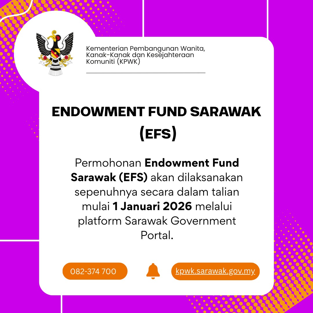 Dimaklumkan kepada orang awam bahawa permohonan Endowment Fund Sarawak bagi tahun 2026 akan dilaksanakan sepenuhnya secara atas talian bermula 1 Januari 2026.