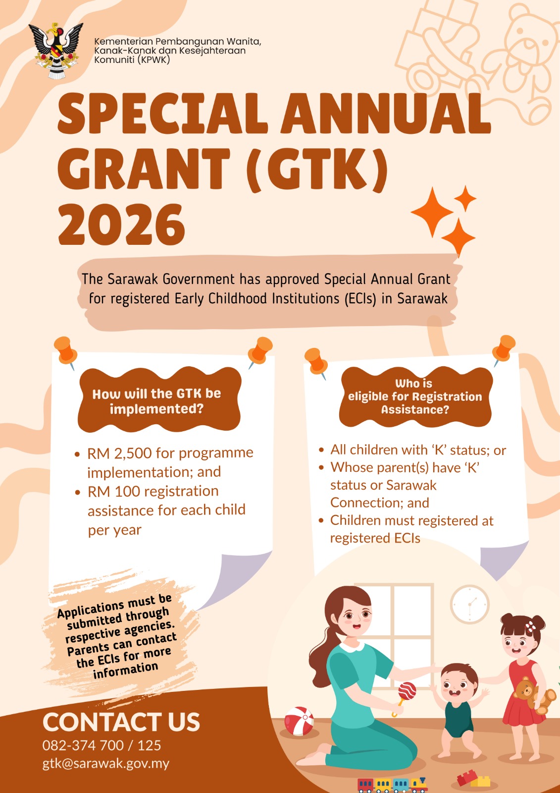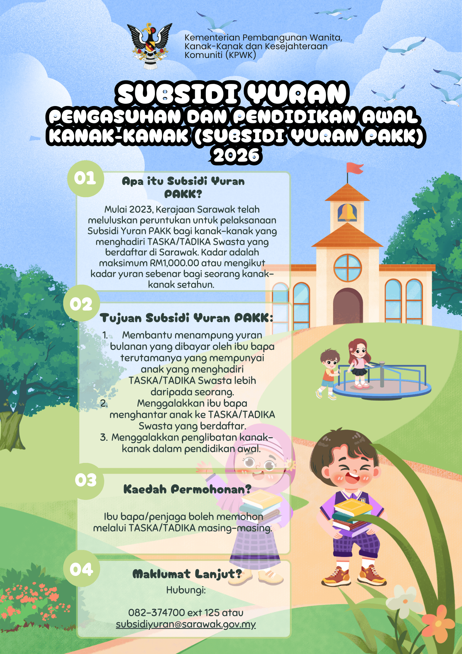 Sebarang maklumat lanjut dan pengumuman berkaitan akan dikemas kini dari semasa ke semasa melalui portal rasmi Kementerian Pembangunan Wanita, Kanak-Kanak dan Kesejahteraan Komuniti.