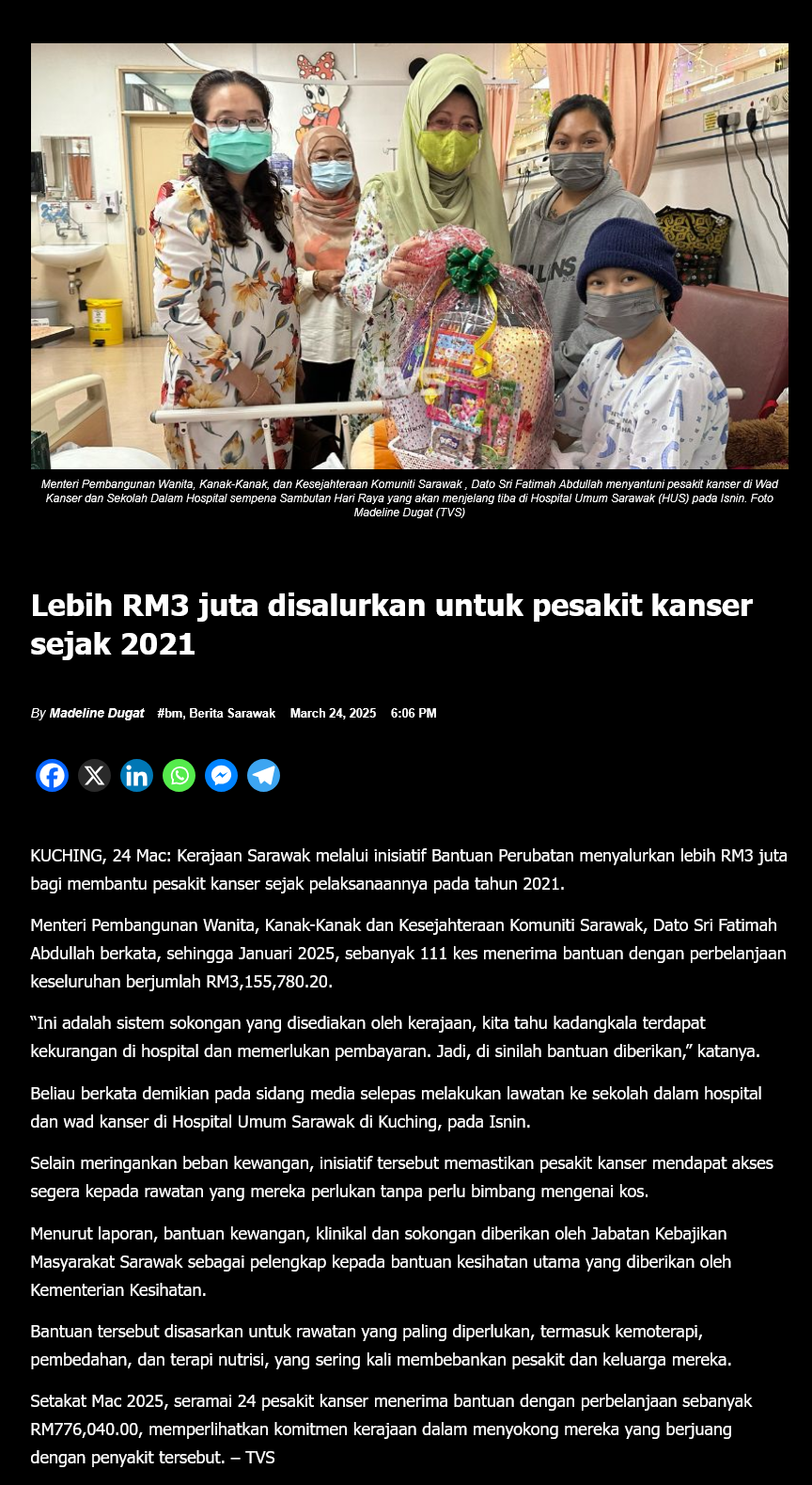 Sumber Berita: https://www.tvsarawak.my/2025/03/24/lebih-rm3-juta-disalurkan-untuk-pesakit-kanser-sejak-2021/