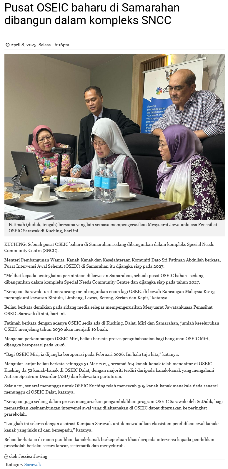 Source of News: https://www.utusanborneo.com.my/2025/04/08/pusat-oseic-baharu-di-samarahan-dibangun-dalam-kompleks-sncc