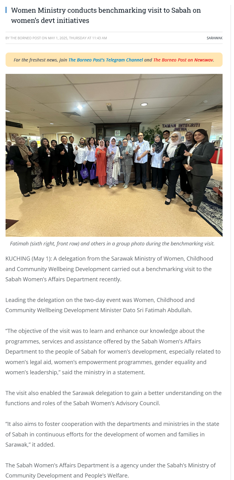 Sumber Berita: https://www.theborneopost.com/2025/05/01/women-ministry-conducts-benchmarking-visit-to-sabah-on-womens-devt-initiatives/